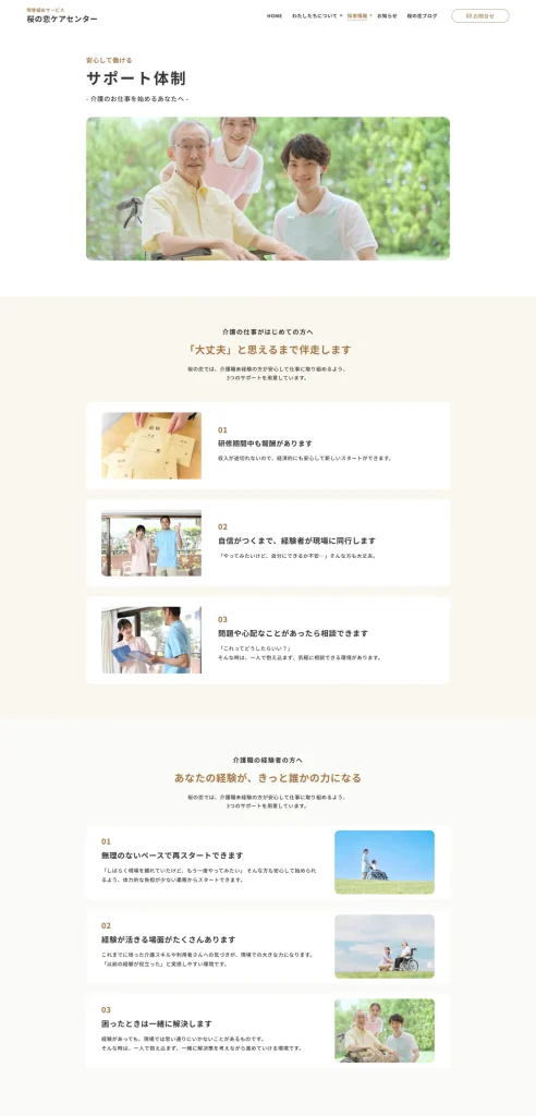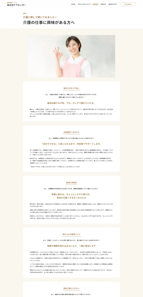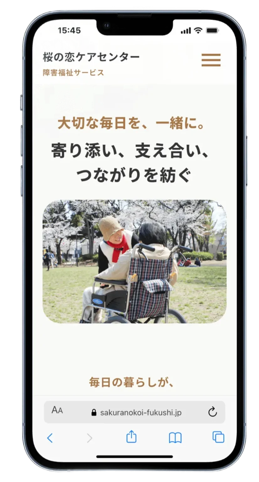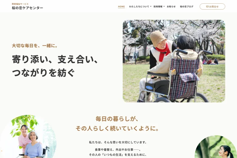 介護福祉事業を行う中で、利用者一人ひとりに向き合った支援を続けていくためには、人材確保という視点が欠かせない状況にありました。一方で、これまで公式なホームページがなく、事業所の考え方や日々の取り組み、働く環境を伝える場が整っていませんでした。同じ障害者総合支援法に基づく介護サービス事業を行っている「かむしぃ」さまからのご紹介もあり、採用を意識した情報発信の土台として、Webサイト制作のご依頼をいただきました。